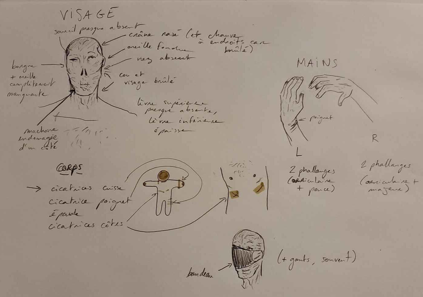 Cicatrices. Visage brûlé (pas de nez, d'oreilles ni de lèvre supérieure), phalanges amputées, quelques cicatrices sur le corps (CF : schéma), borgne.
