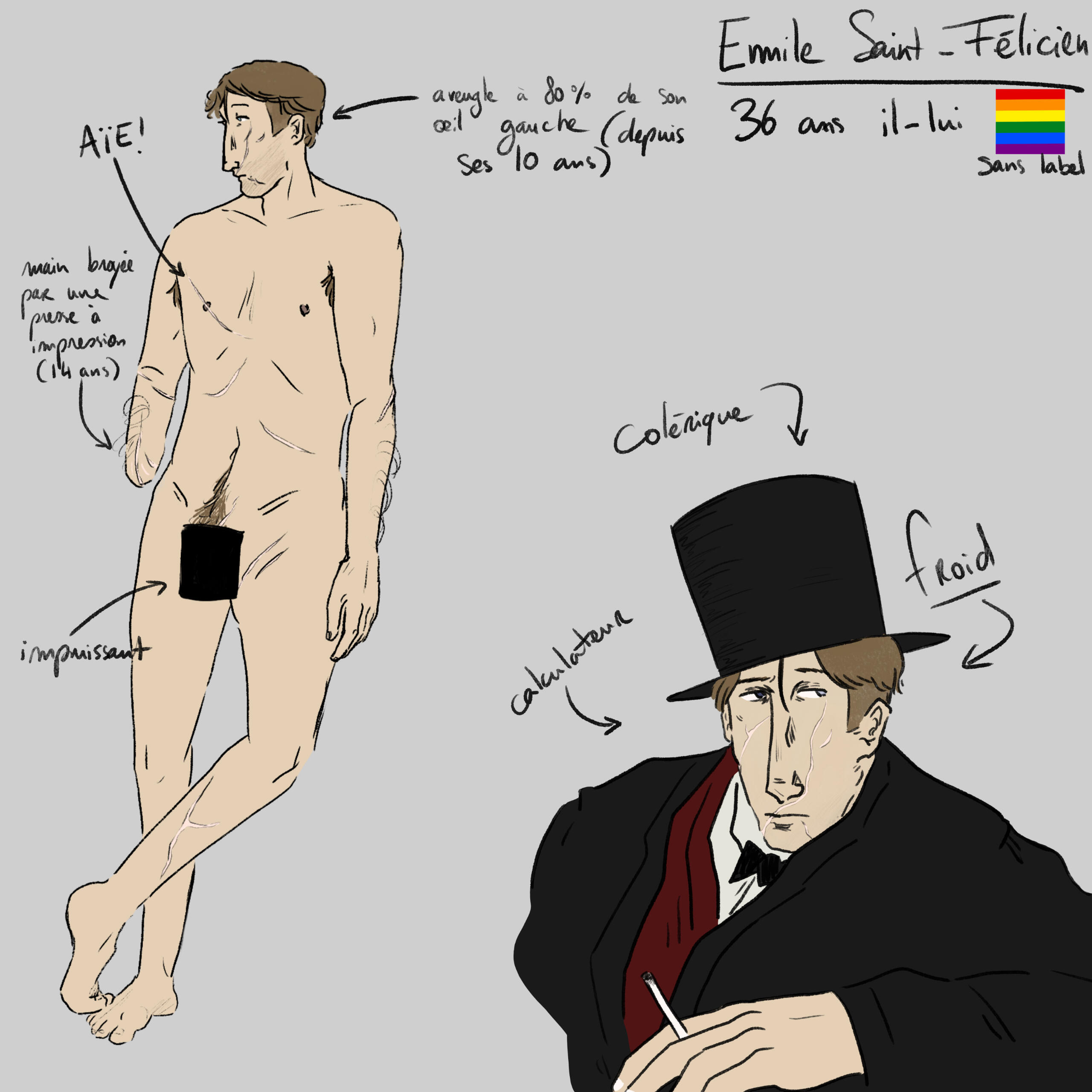Enfance. Né fils du propriétaire d'un journal célèbre (LA NOUVELLE ENCRE), le riche, opportuniste, violent et arrogant Jacques Saint-Félicien, Émile a longtemps subi le courroux de son père, qui n'a jamais aimé ses enfants comme il l'aurait dû, et qui a préféré leur donner pour héritage de nombreuses cicatrices. Battu, humilié et insulté, Émile grandit dans le silence et la froideur. Tout le prédestine pourtant à reprendre le journal : en tant qu'unique garçon de sa fratrie, aucun autre choix ne s'offre à lui.